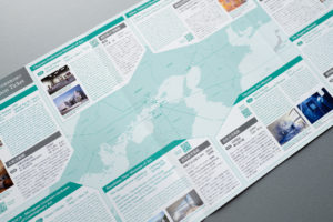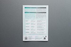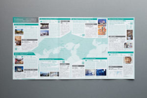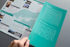基調としているテーマカラーの緑は特色で印刷し、表紙の緑とグレーのグラデーションも表現。パンフレット折り返しを短手に加工することで、見開きへの動線を設計しています。