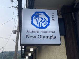 直島・宮ノ浦にある三代続く老舗の日本料理屋ニューおりんぴあ様の看板。海外観光客向けに英語を入れた看板が必要とのことで、ご依頼いただきました。昔ながらのライトボックスにカッティングシート貼りで製作し、ロゴは先代からのマークをトレースして使用するなど、これまでにつくられてきた店構えの印象や周囲の景色を崩さないデザインを意識しました。