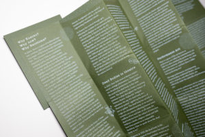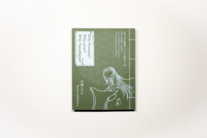 アーティストワーク、小冊子本体 蛇腹折り+Z折り 表1表4貼り付け2025−Artist: 芦澤いずみ 様Print: インサツビト 様CL: 令和人形浄瑠璃せとうち九相図プロジェクト実行委員会 様現代パフォーマンス作品に関するアーティストテキストを掲載した豆本。本体は蛇腹折りで展開する仕様。ディープマットオリーブ紙にホワイトインク一色刷り